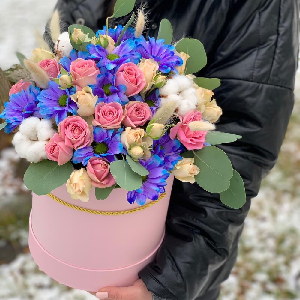 Необычная шляпная коробка с синей хризантемой и кустовой розой, дополнена милыми сухоцветами: хлопком и лагурусом, ароматным эвкалиптом