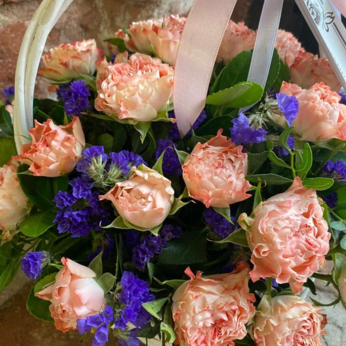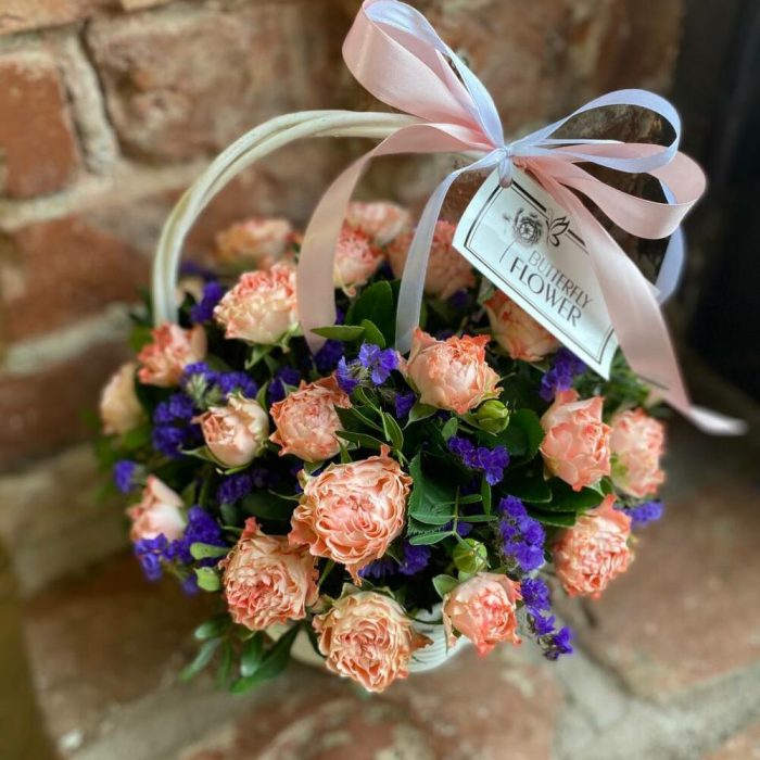 Корзина с кустовыми розами и статицей “Васильковый рассвет”