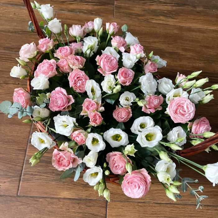 Лизиантус – 10 шт.Роза кустовая – 15 шт.Эвкалипт – 7 шт.Корзина плетеная – 1 шт.Оазис флористический – 1 шт.