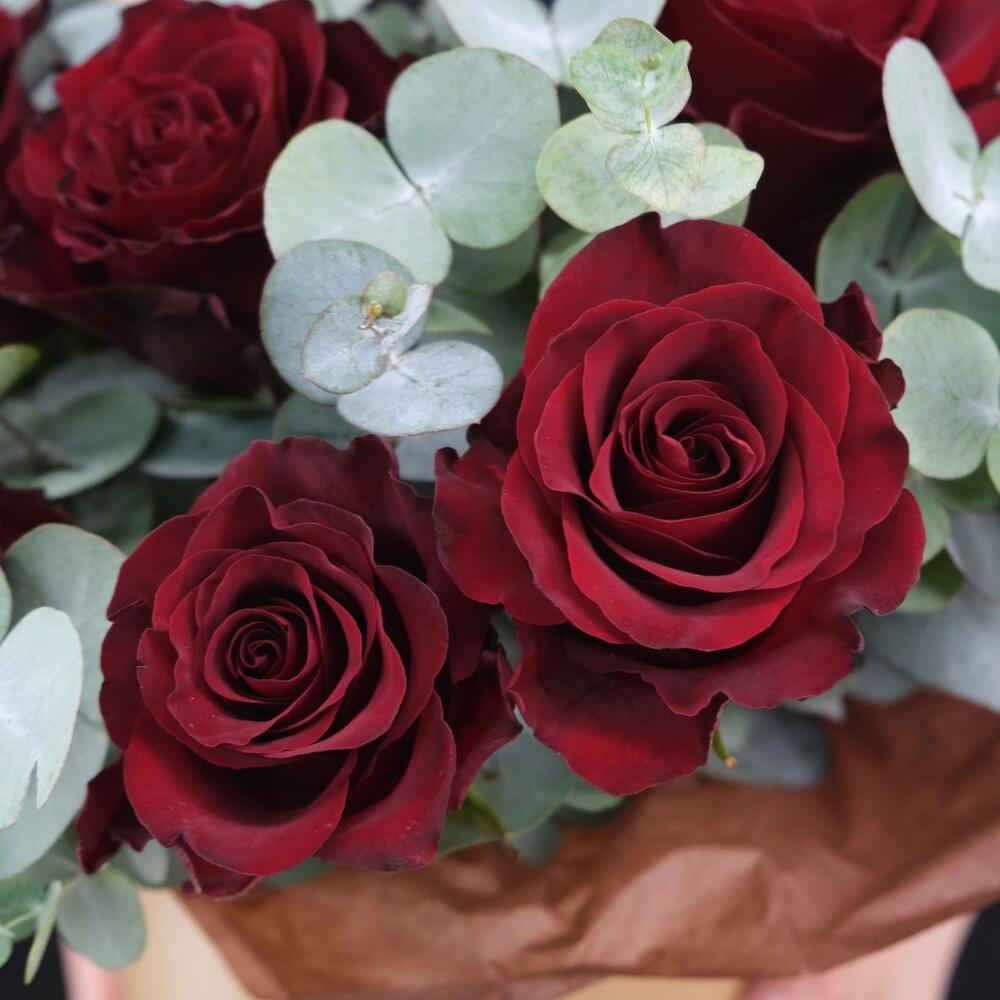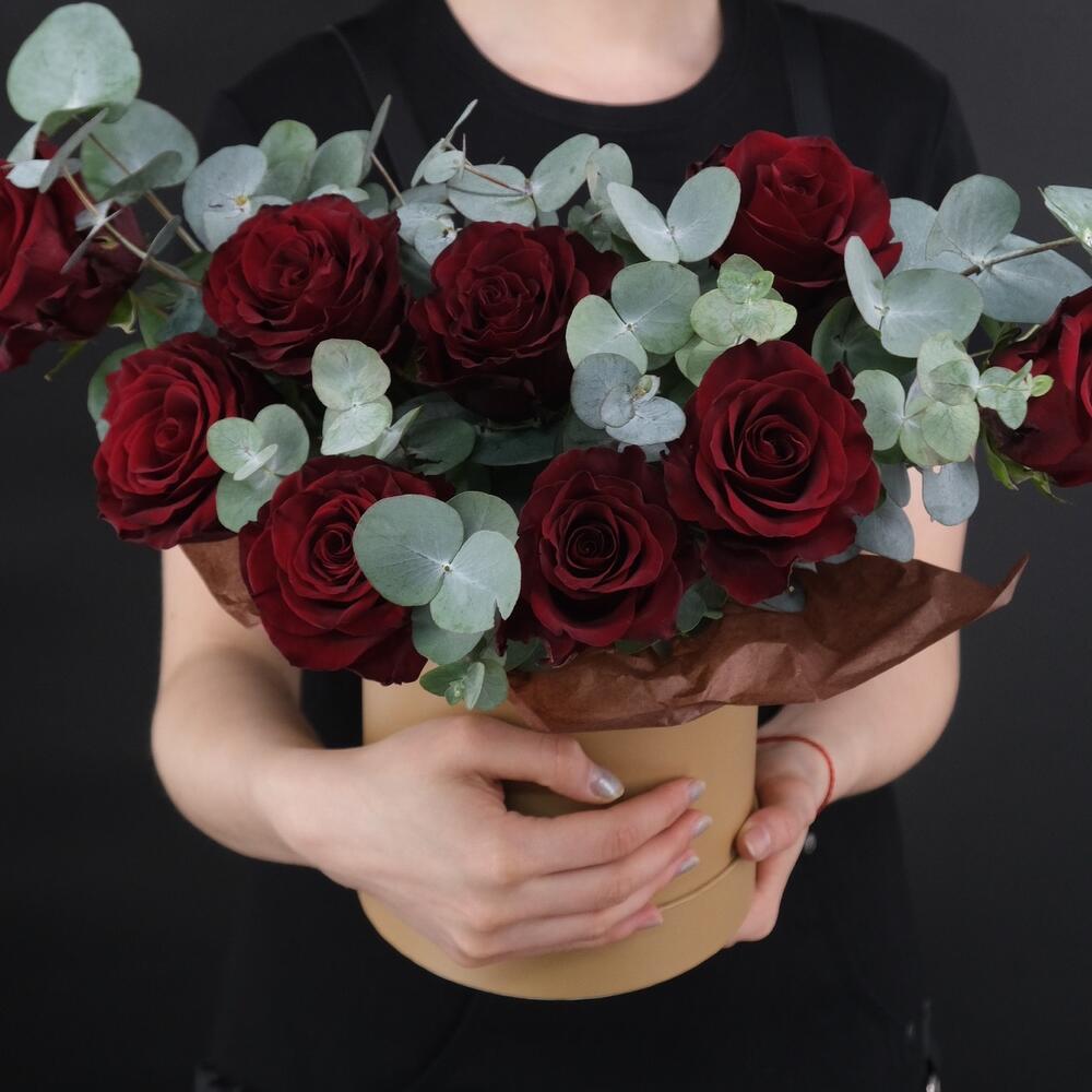 Эвкалипт – 2 шт.Роза – 9 шт.Инструкция по уходу – 1 шт.шляпная коробка с оазисом – 1 шт.подкормка для стойкости цветов – 1 шт.