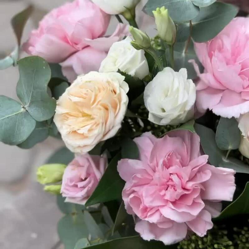 Лизиантус – 1 шт.Роза кустовая – 1 шт.Эвкалипт – 3 шт.Роза Эквадор – 1 шт.Шляпная коробка – 1 шт.Скиммия – 3 шт.Оазис флористический – 1 шт.Диантус сортовой – 4 шт.печенье «счастье» ангел – 1 шт.