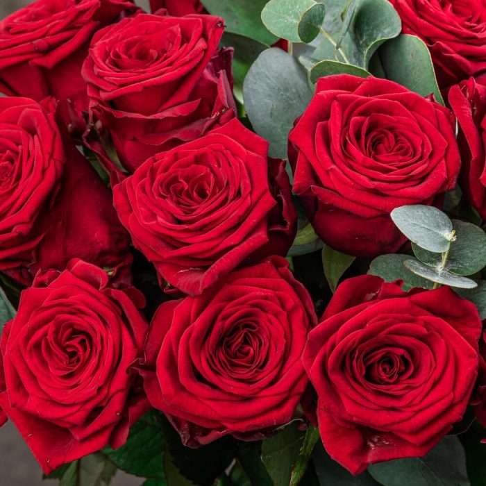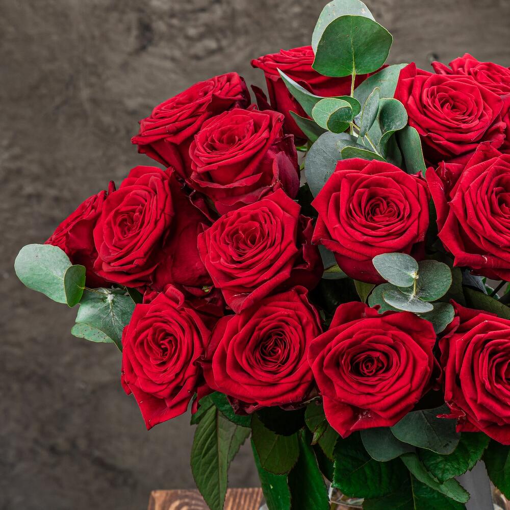 Монобукет из красных роз с эвкалиптом