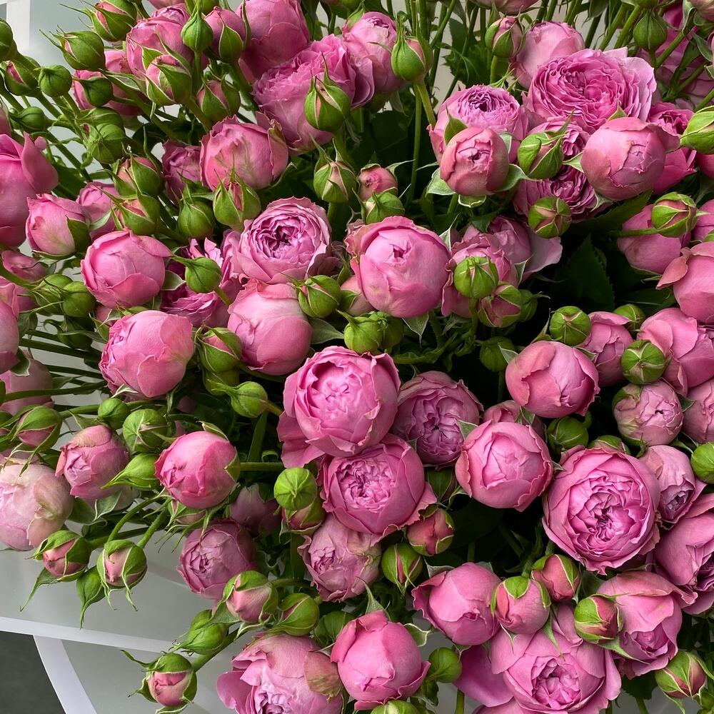 Лента атласная – 1 шт.Упаковка дизайнерская – 7 шт.роза кустовая пионовидная мисти бабл – 25 шт.