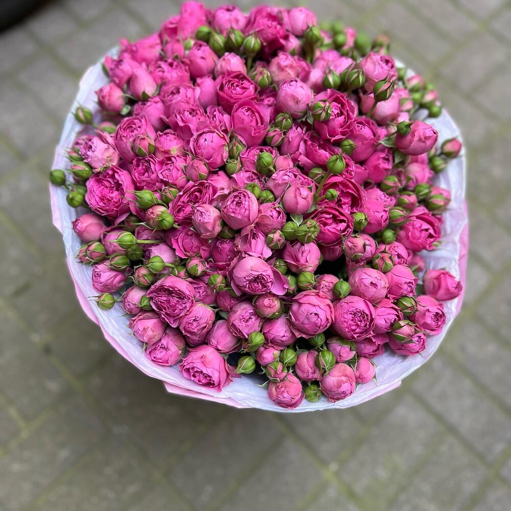 Шикарный букет с пионовидной кустовой розой. Количество 35 штук, но смотрится очень пышным и объёмным. Подойдёт любителям пионов, так как внешне бутончики напоминают пионы.