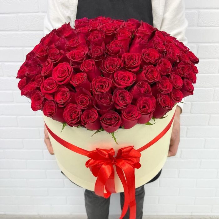 розы эквадор – 101 шт.Шляпная коробка – 1 шт.Лента атласная – 1 шт.