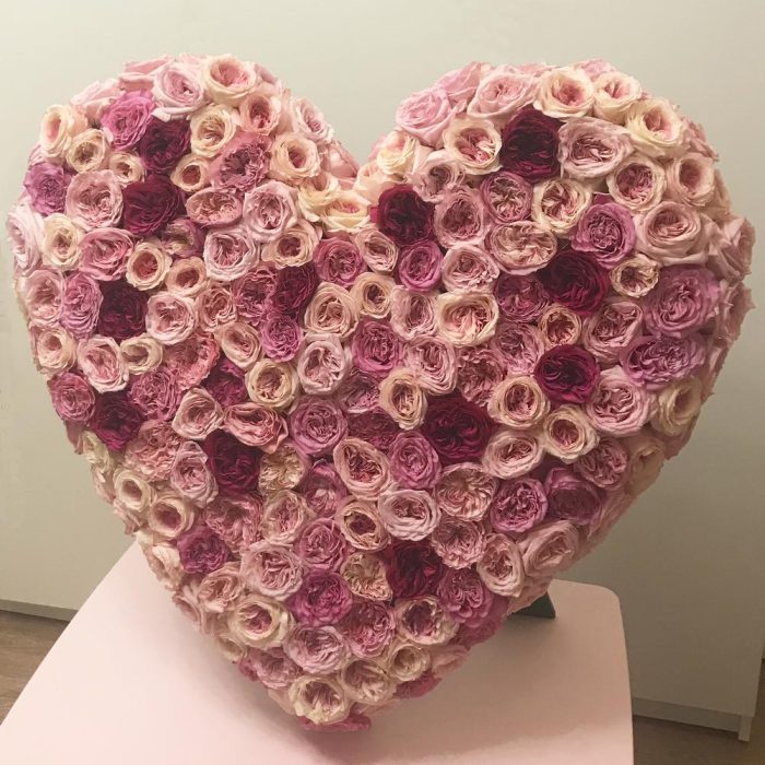 Очень большая композиция из пионовидных ароматных роз элитных сортов Дэвида Остина, выполненная в виде сердца на специальном оазисе – мольберте.Композицию можно расположить как вертикально (угол наклона можно регулировать), так и горизонтально (при необходимости).Розы сортов Дэвида Остина отличаются невероятной красотой, пионовидным строением бутона, а некоторые сорта (они входят в состав этой композиции) волшебным ароматом. Тот самый случай, когда никаких слов не подобрать, чтобы выразить свои чувства, а надо поразить девушку в самое сердце. Ни одно не устоит!:)