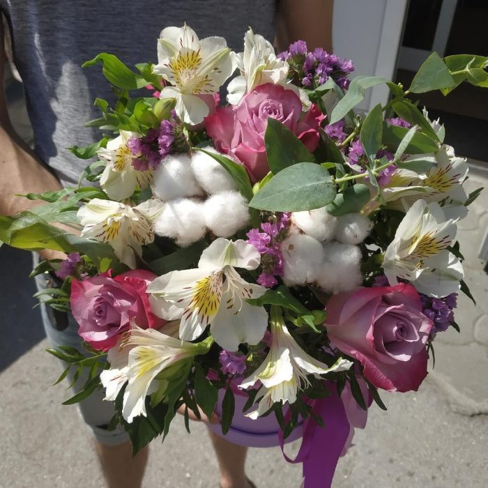 Коробка шляпная – 1 шт.Фисташка – 4 шт.Эвкалипт – 2 шт.Роза – 5 шт.Альстромерия – 6 шт.Статица – 3 шт.Хлопок натуральный – 2 шт.Оазис флористический – 1 шт.