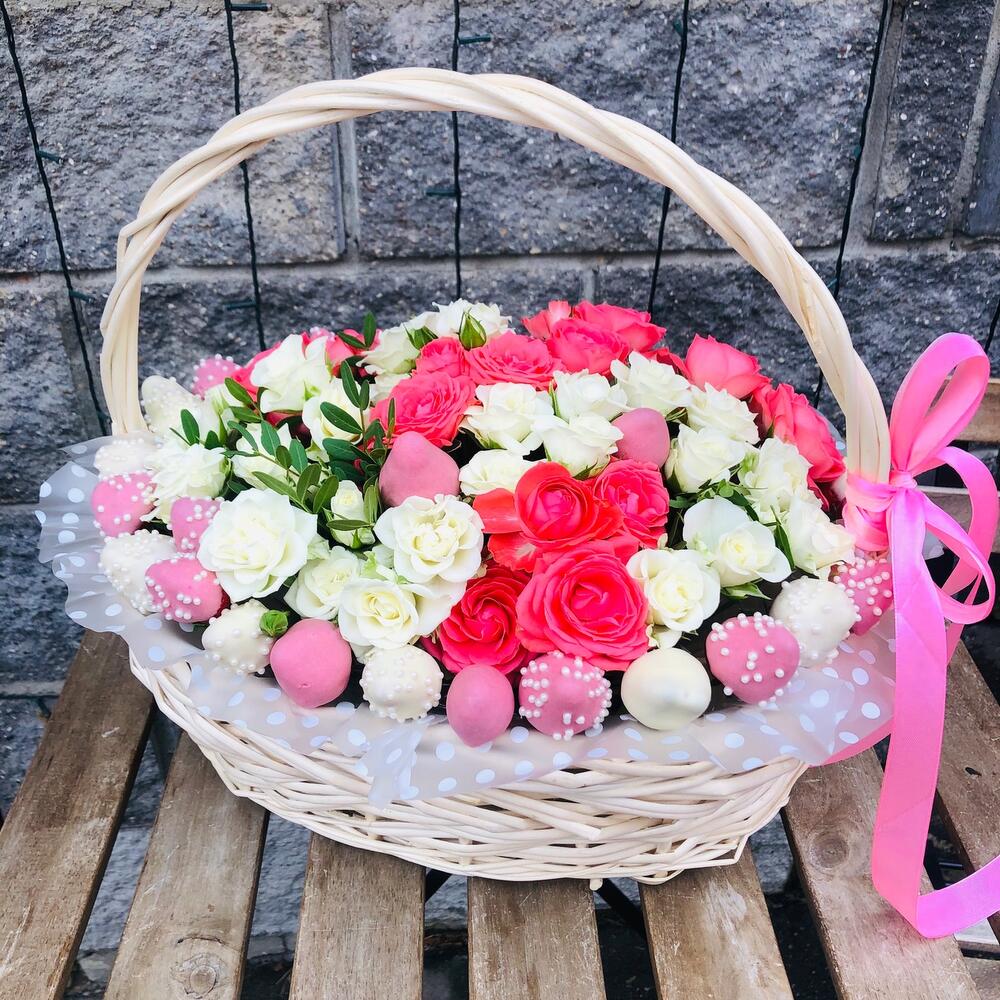 Корзина – 1 шт.Клубника – 1000 гр.Роза кустовая – 5 шт.Зелень – 1 шт.