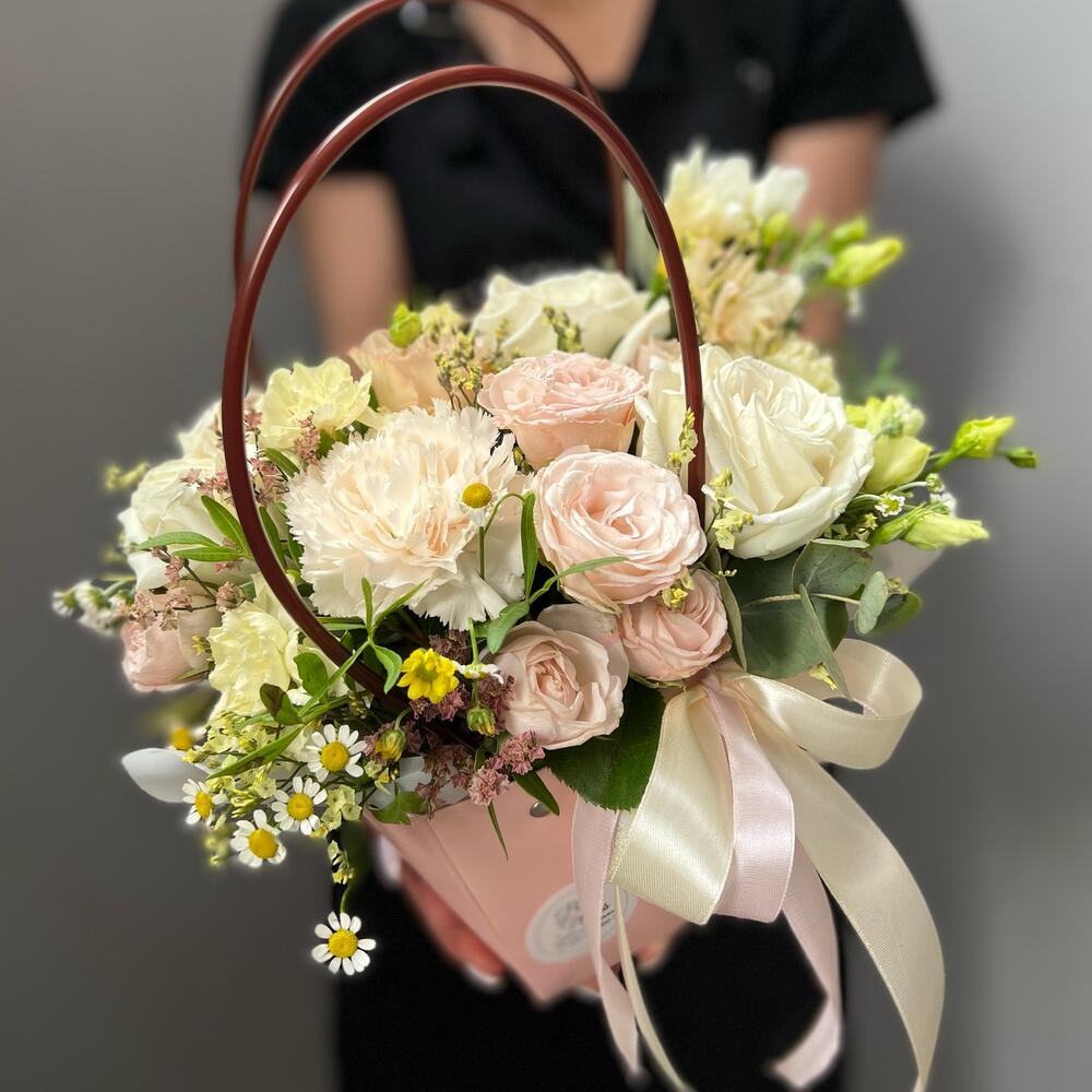 Нежная композиция с цветами в удобной крафт сумочке.