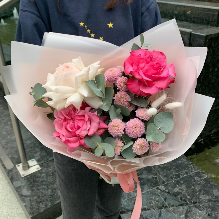 роза кантри блю – 2 шт.роза вайт о хара( ароматная) – 1 шт.сантиния кустовая – 2 шт.Эвкалипт – 1 шт.Упаковка дизайнерская – 1 шт.