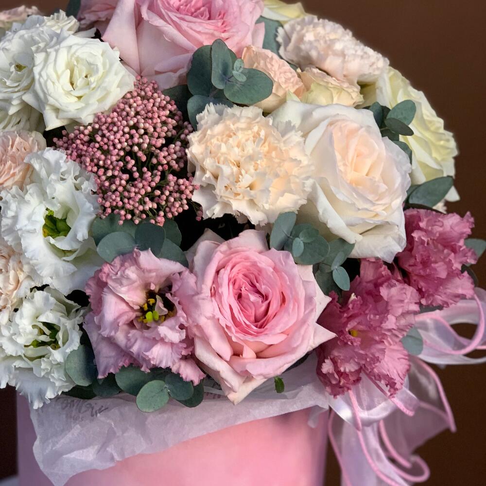 Альстромерии, Гвоздики, Кустовые розы, Лизиантусы, Розы, Хризантемы