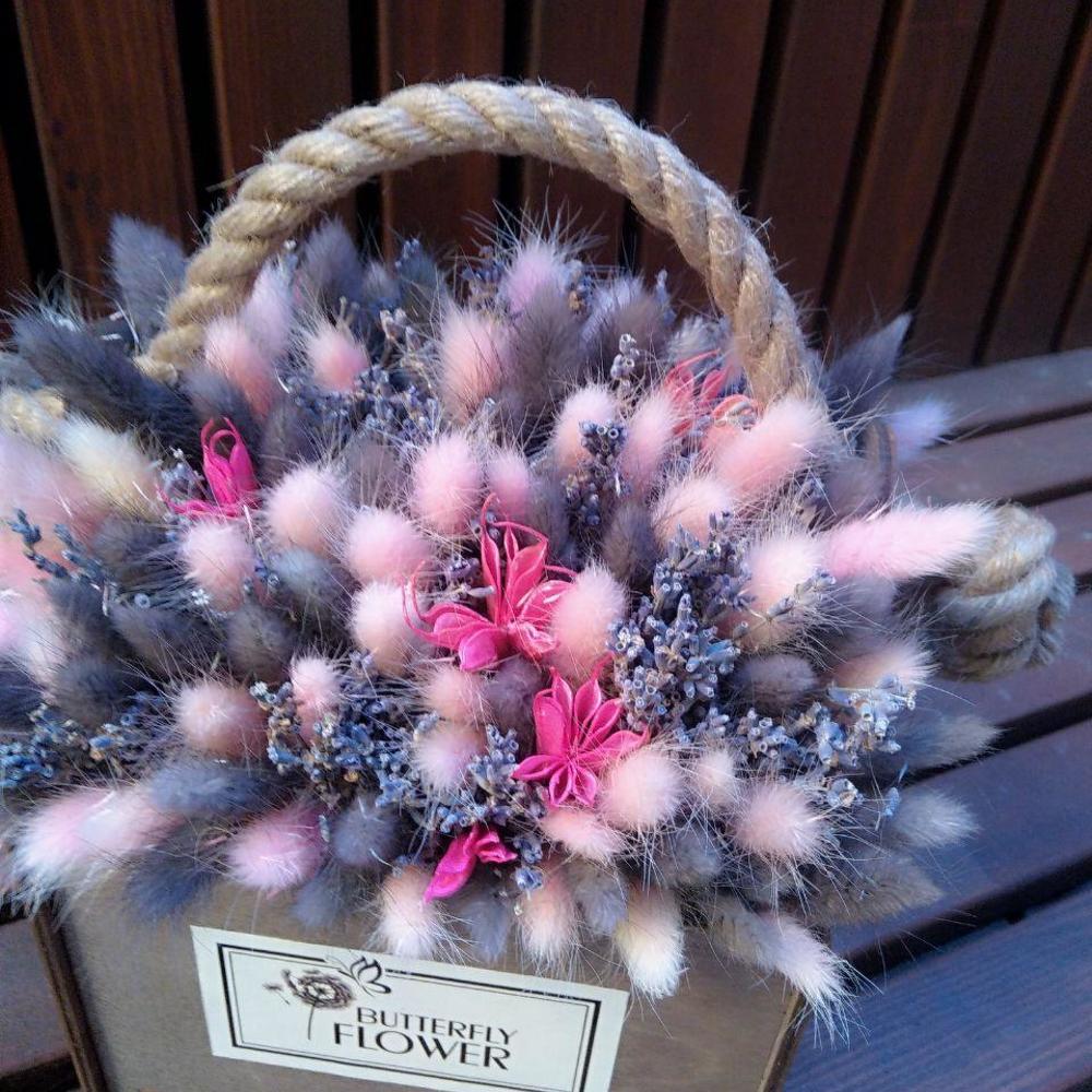 Букет из сухоцветов – лагуруса, лаванды и нигеллы в стильном деревянном ящике “Краски Майорки”
